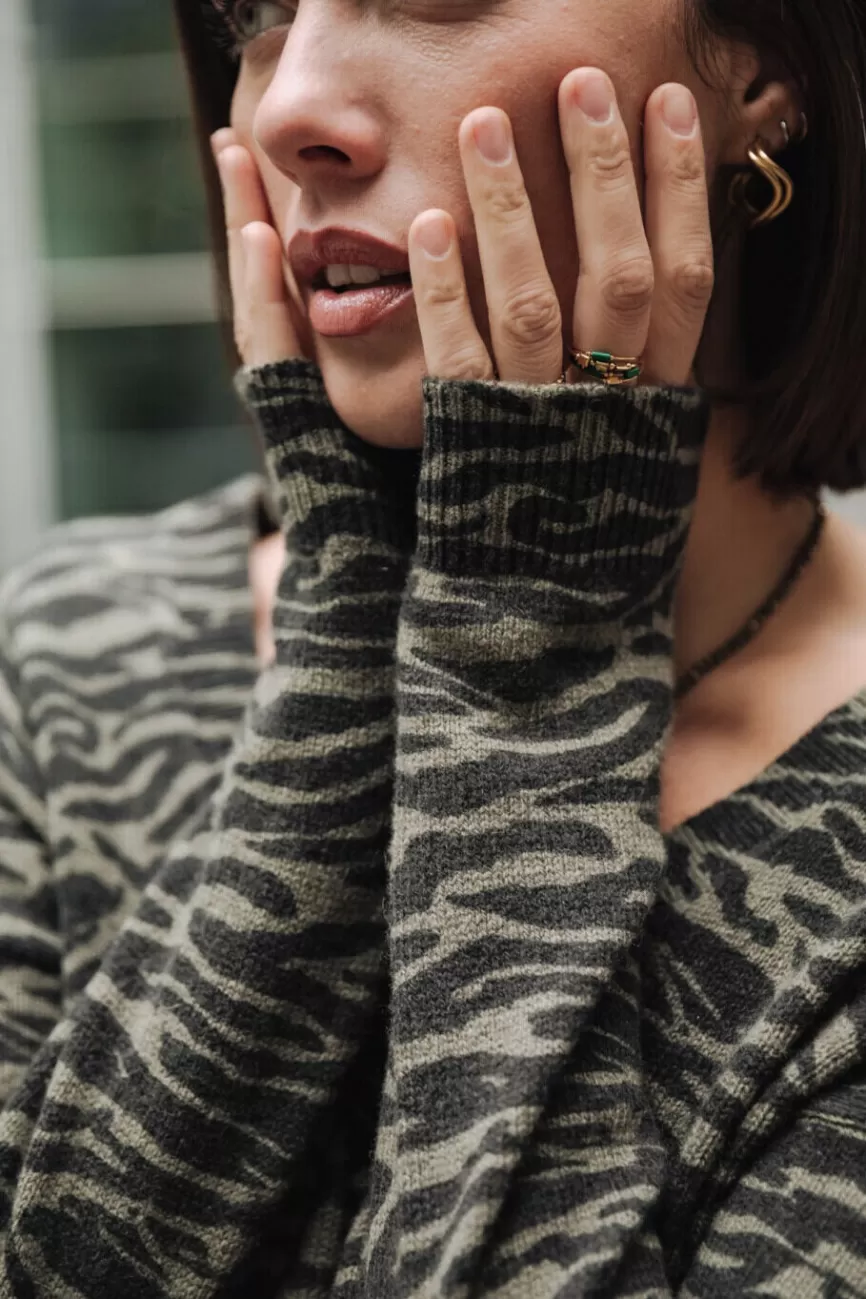 • Pull en maille fluide entièrement imprimé d’un motif zebré noir fond kaki